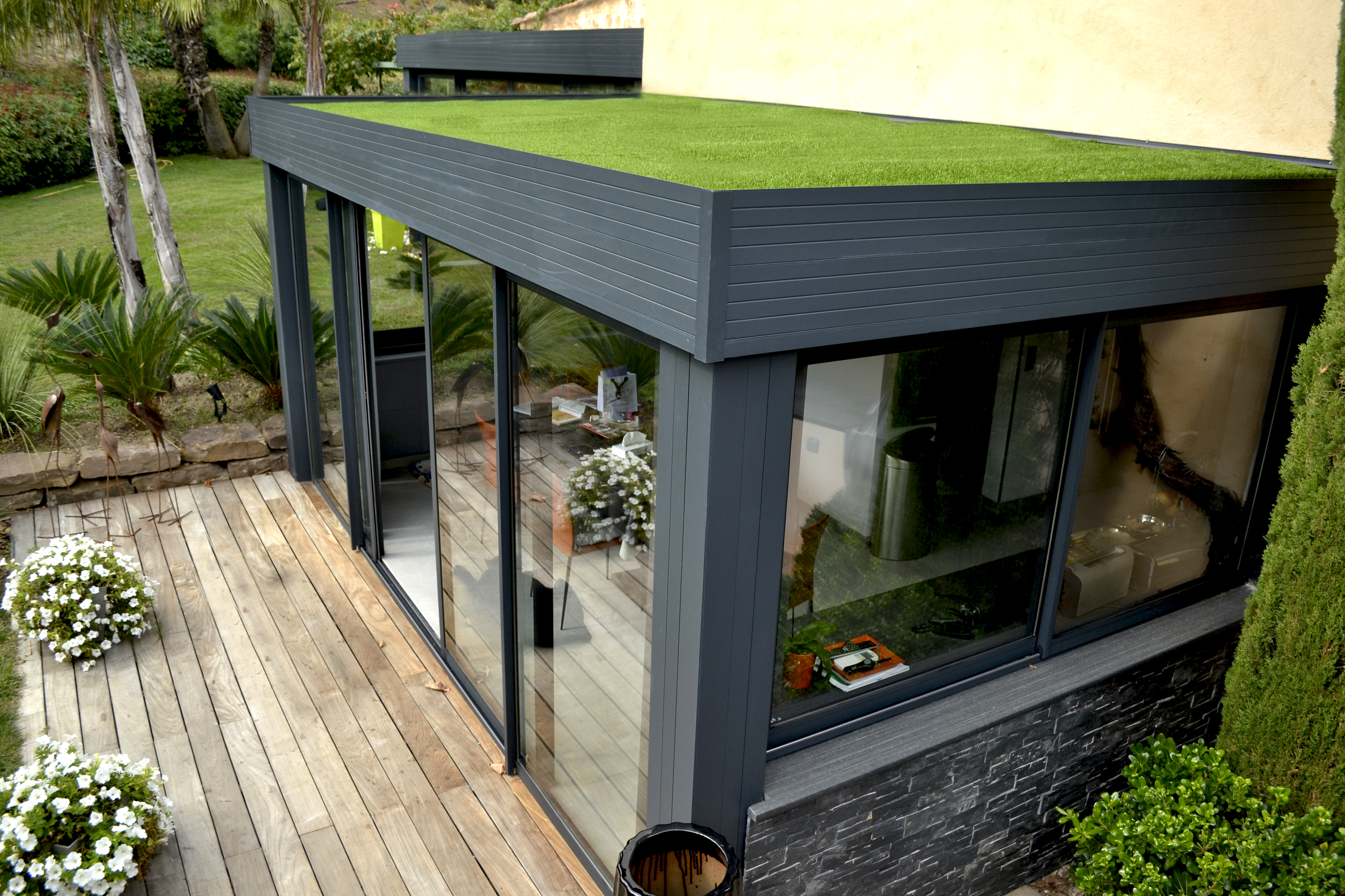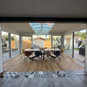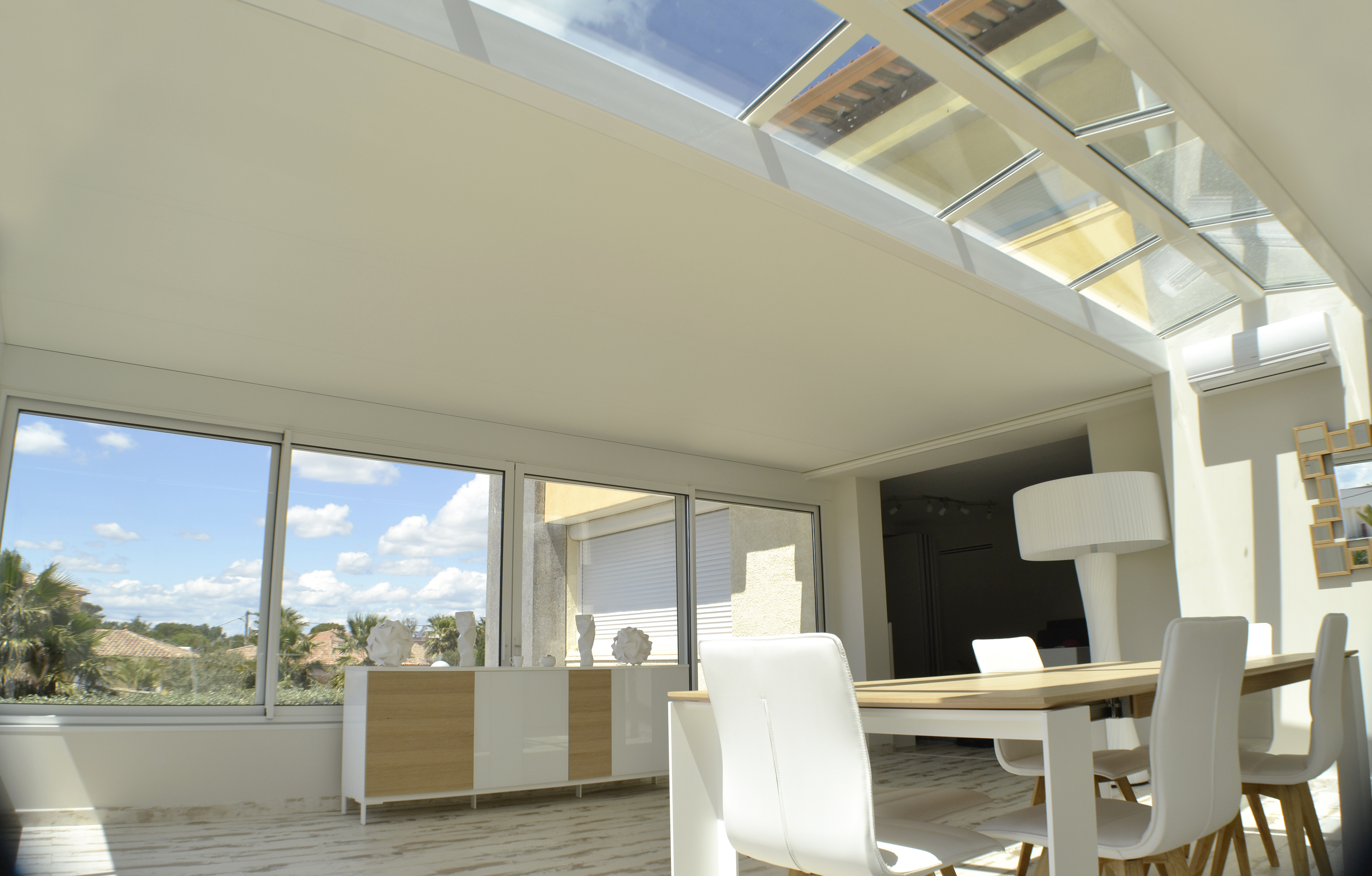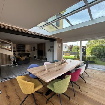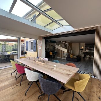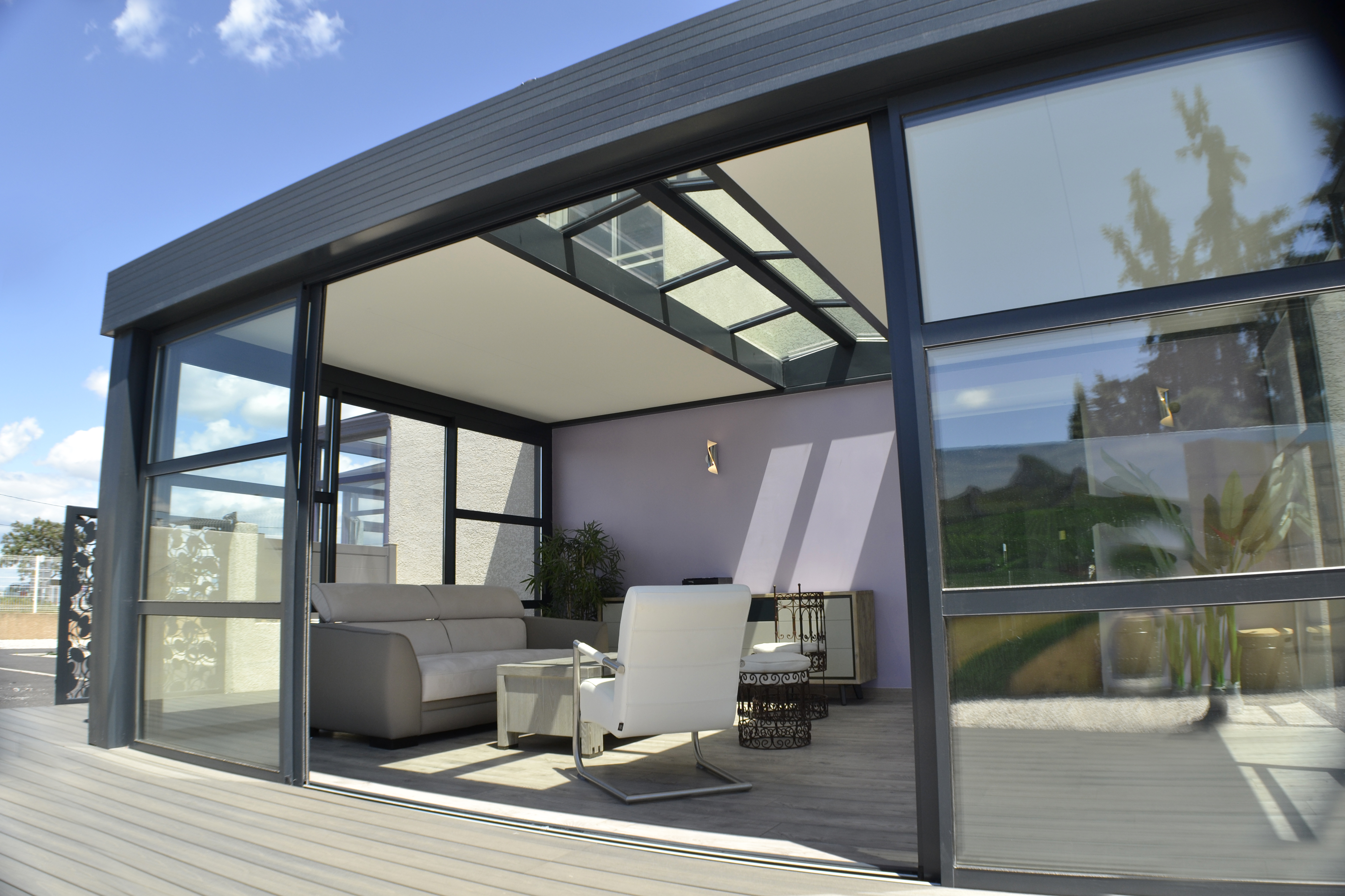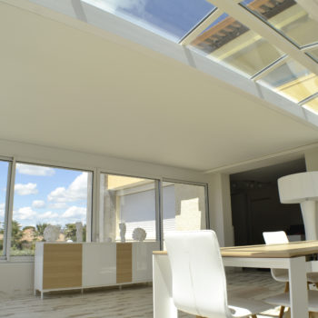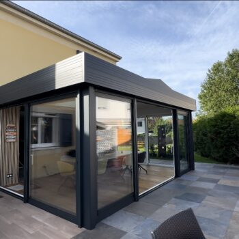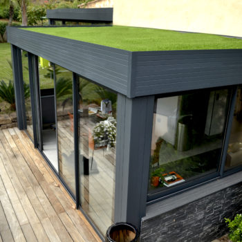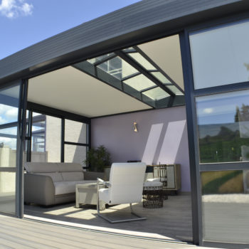 Les extensions à toit plat Espace Lounge sont composées d’une structure aluminium à rupture de pont thermique et d’une toiture en panneaux isolants pour un confort thermique hors du commun, été comme hiver. Ajoutez le puits de lumière qui vous assure une clarté et un éclairage naturel tout au long de l’année.